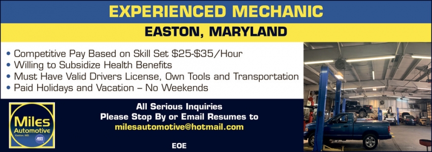 Jul 02, 2023. Miles Automotive Mechanic Jobs from Eastern Shore Careers